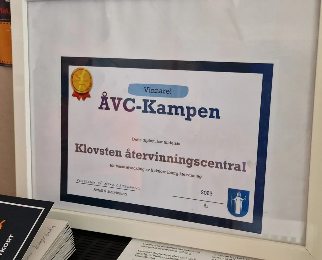 Stort Grattis till Klovstens ÅVC som vann ÅVC-kampen 2023! Det blev ett trevligt tårtkalas med prisutdelning och tal av Monica Neptun som är ordförande för Teknik Kungsbacka kommun. Barnamossens ÅVC kom på andra plats och Frillesås på tredje plats. På samtliga återvinningscentraler var det en minskning av mängden avfall till energivinning per invånare. Tävlingen gick ut på att öka andelen rätt sorterat återvinningscentralerna.